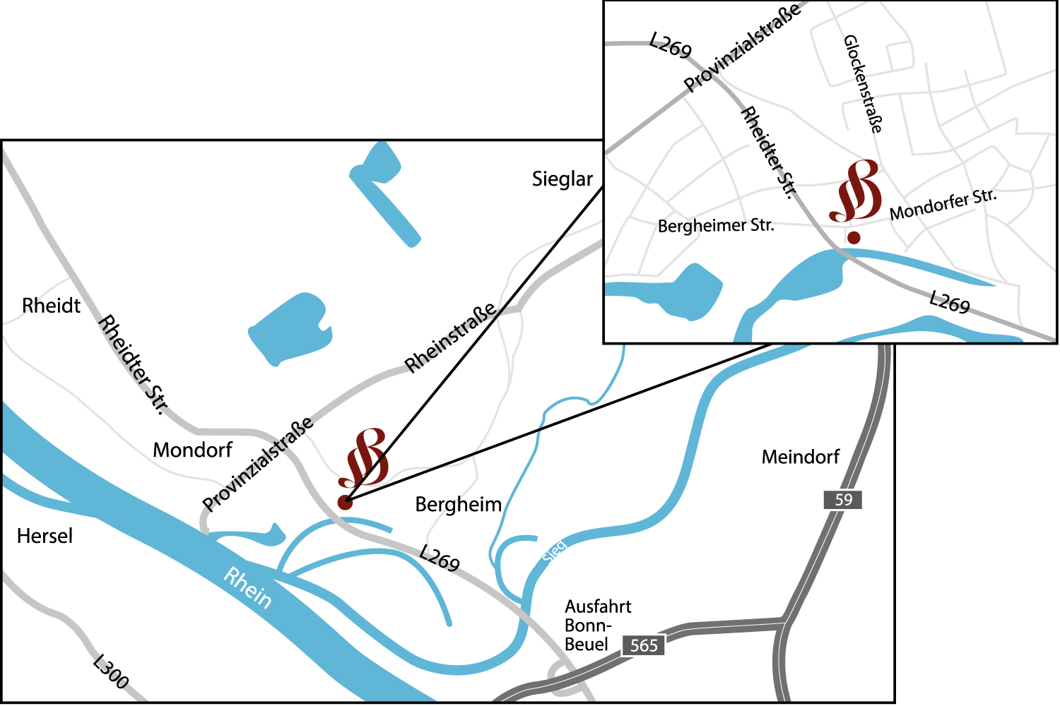 Autobahn A565 (zu erreichen über die A59), Ausfahrt Bonn-Beuel-Nord, links abbiegen auf die L269, nach Erreichen des Ortsschilds Mondorf an der Ampel rechts abbiegen in die Provinzialstraße, an der Mundorf-Tankstelle rechts abbiegen in die Glockenstraße, nach ca. 500m am Ende rechts in die Mondorfer Straße abbiegen. Der Weg zur Kanzlei befindet sich linksseitig.
